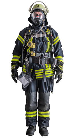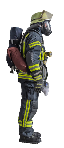 Gegen Atemgifte, zum Beispiel bei einem Brandeinsatz, schützen sich die Feuerwehrleute entweder mit Atemschutzmaske und Filter oder mit atemluftunabhängigem Atemgerät, einem sogenannten Pressluftatmer, sowie einer Flammschutzhaube.