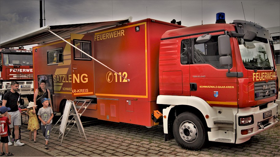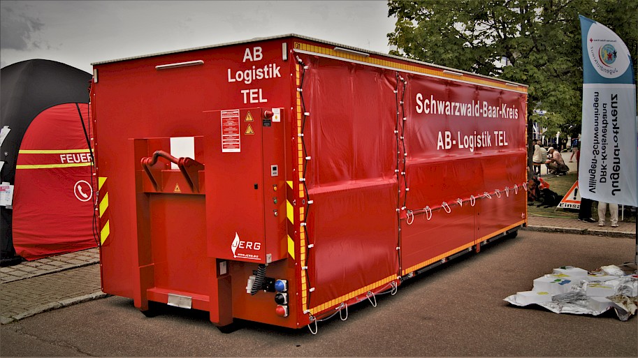 Der Führungsstab hält für seine Arbeit ein eigenes Fahrzeug, den Einsatzleitwagen 2, stationiert in VS-Schwenningen und mehrere Abrollbehälter vor.